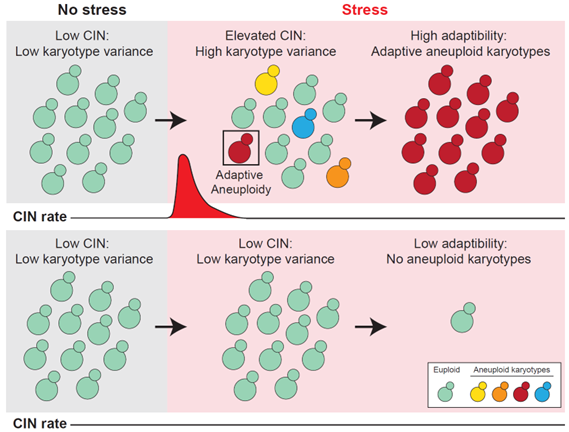 We study how fungi exploit Chromosome Instability (CIN) to adapt to stress.  Mistakes during mitosis result in CIN and unbalanced, aneuploid karyotypes. In most contexts, aneuploidy lowers cell fitness. However, in fungi, CIN and aneuploidy can be beneficial during stress. Aneuploid karyotypes can survive diverse stress conditions, from elevated temperatures to antifungal treatment, pointing to CIN as a driver of adaptation. Intriguingly, the rate of CIN is elevated in stress, opening the possibility that cells have pathways to destabilize their genomes and accelerate adaptation.