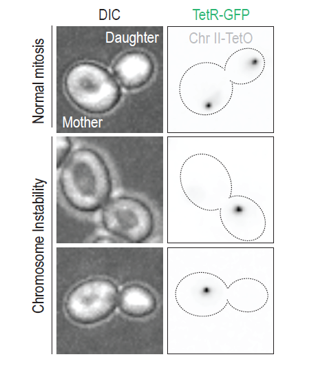 An example of Chromosome Instability (CIN) in budding yeast. Chromosome II is directly visualized using a Chr II Tet-O array and expression of TetR-GFP that binds to the array. In normal mitosis (top), chromosomes are partitioned symmetrically between the mother and daughter cell. In the case of chromosome instability (CIN), both copies (marked by a clustered, single, brighter foci) end up either in the mother or the daughter cell, generating unbalanced, aneuploid karyotypes (Adapted from Mirkovic et al 2025).
